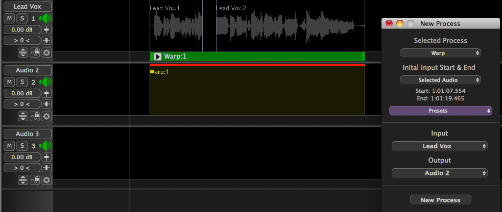 If you want to temporarily bypass the Warp processing you have done, to compare the original audio, press the comma (,) key and the audio will turn bright green to indicate. A red bypass warning is shown. Press comma again to revert to the processed audio.