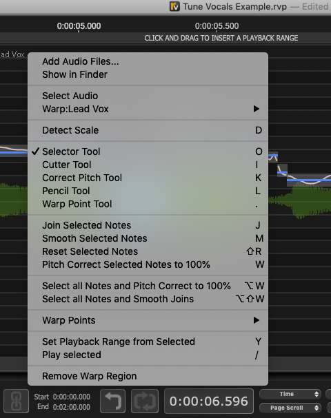 In order to do detailed editing of timing, pitch, level or formants in the Warp Output track, you can RIGHT CLICK in the Output Track to bring up the menu shown right, to see and select the available options (or use the Keyboard Shortcuts shown).