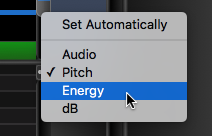 To do this, LEFT CLICK on the Guide or Dub's track Display's Scaling Selector (showing "Pitch" in the image below left) to bring up the list shown below right and select "Energy".