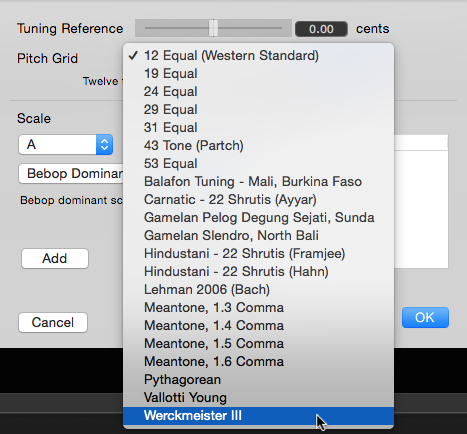 As can be seen from the example setup dialogs above, it's possible to choose the pitch grid or temperament on which the scale tuning is based (e.g. 12 note equal temperament as currently selected, or say the baroque organ temperament Werckmeister III), the base key of the scale displayed (showing A), and the type of scale (currently selecting Major in the right-hand picture). Other esoteric tunings are available, including various microtonal scales, Gamelan scales and historic temperaments. Furthermore there is a whole range of major and minor scale grids, based on these temperaments, as well as jazz and modal scales such as Bebop and Blues.