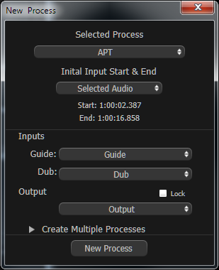 If the settings in that window are correct, then click New Process button (or press the keyboard N key) and Revoice Pro will use the process's User Default settings to process and play the audio.