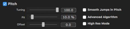 In Music mode the process first separates the Guide and Dub pitch into average (Tuning) and modulations (Fit), with controls to adjust the transfer as shown below.