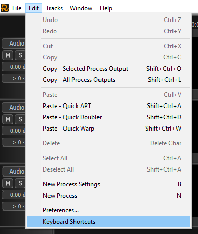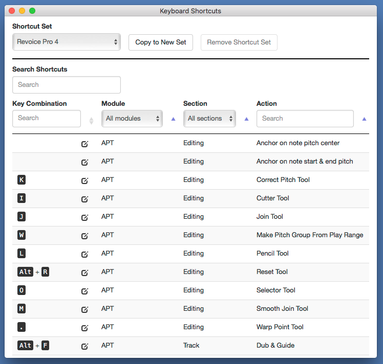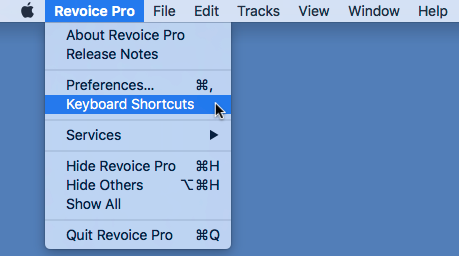 This manual lists the behaviour of the keyboard shortcuts when the Revoice Pro 3 Shortcut set is selected.