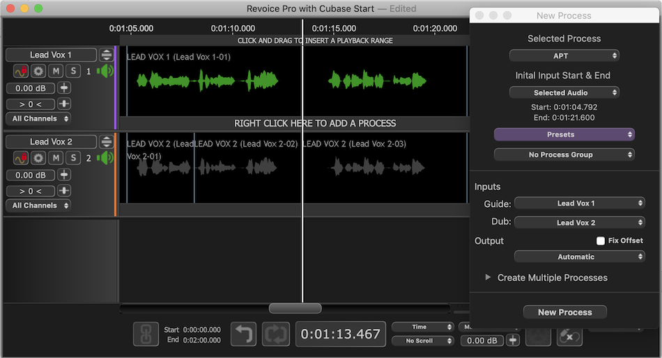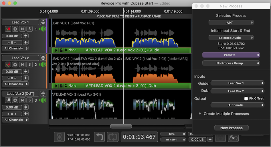 The ARA interface will automatically map the output of the APT process for the Dub signals Lead Vox2 (...) back to the corresponding Audio Events in Cubase Pro.