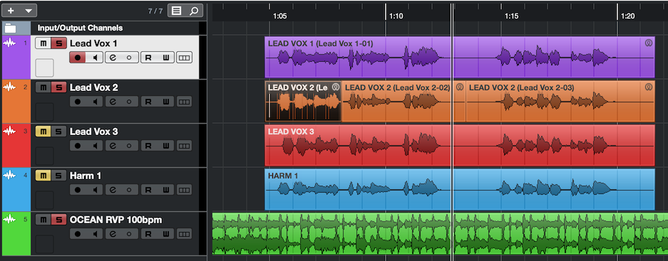 In this example, Cubase will replay the aligned versions of the three Lead Voxs 2 (generated by Revoice Pro's APT process) in place of the original audio