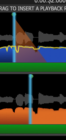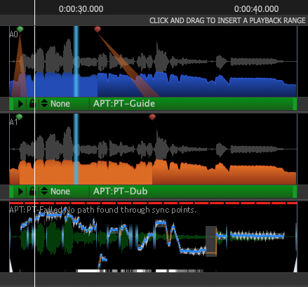 Sync Points are always pairs of points, one in the Guide, one in the selected Dub, shown as green dots above the waveform display on each track when working correctly, but red if moved to a time when it is impossible to achieve alignment. In the latter case the aligned output (shown in the third track below) shows a red dotted line and 'Failed No path found through sync points'.