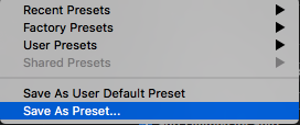 To save one of your own settings as a Preset, select Save as User Default Preset and/or Save As Preset in order to reuse it.