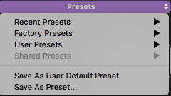 Clicking the Presets button that appears in a Process Control Panel will bring up the menu shown right with Saving options. (If no User Presets have been saved, that entry would be greyed out, similarly to Shared Presets as shown.)