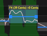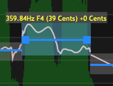 - To select one note or non-pitched block: click on the note, transition or non-pitched block to select it. Selected Blocks are indicated by a Block colour change. The yellow text above shows the nearest identified pitch of the note, plus or minus x cents, and any pitch shift applied to it in cents at the end. If Show Frequency in Hz is enabled in Preferences > Editing then the note's frequency is displayed first. (This is turned off by default, so as not to show too much information.)