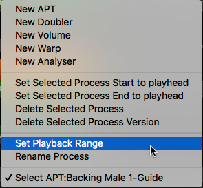 One way to quickly set a Playback Range is to set it to the same range as a Process Control Block. For example, a short Playback Range is shown below in yellow and an APT Guide Process Control block is shown in green.