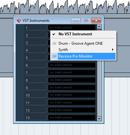 Select one of the entries in the dialog and a menu will be displayed showing the available instruments. Select Revoice Pro Monitor.