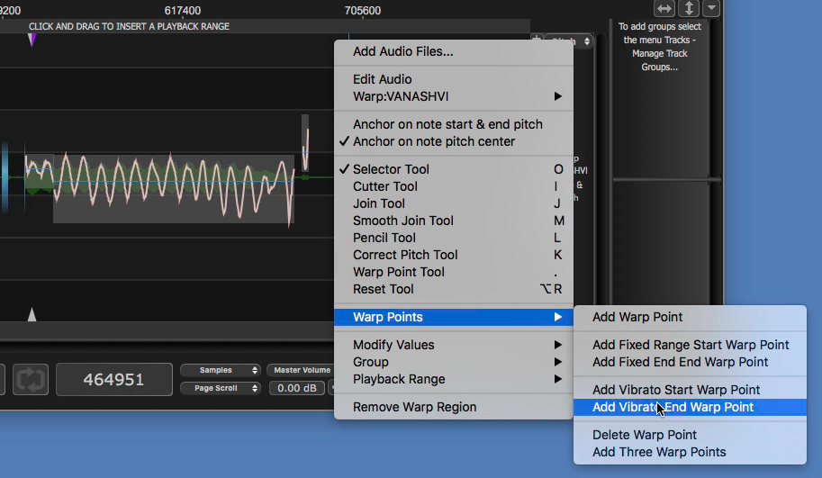 Add a vibrato start point by right clicking at position of the point and selecting the Add Vibrato Start Warp Point menu item.