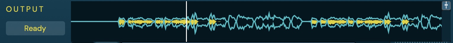 The Output appears in the bottom of the three default waveform views, as a solid yellow waveform overlaid with a blue outline of the Guide waveform to show time alignment of the Output relative to the Guide.