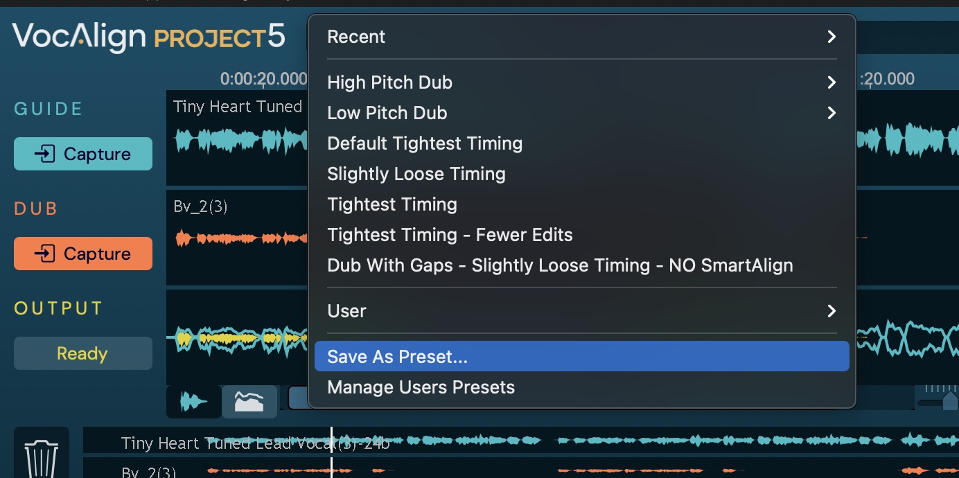 NOTE: Immediately after starting VocAlign Project 5, when the screens are empty, if you select a preset before capturing the first Guide and first Dub, you won’t be able to adjust any of the controls until a Guide and Dub have been captured. However, the selected preset will be applied automatically as soon as the Dub is captured.
