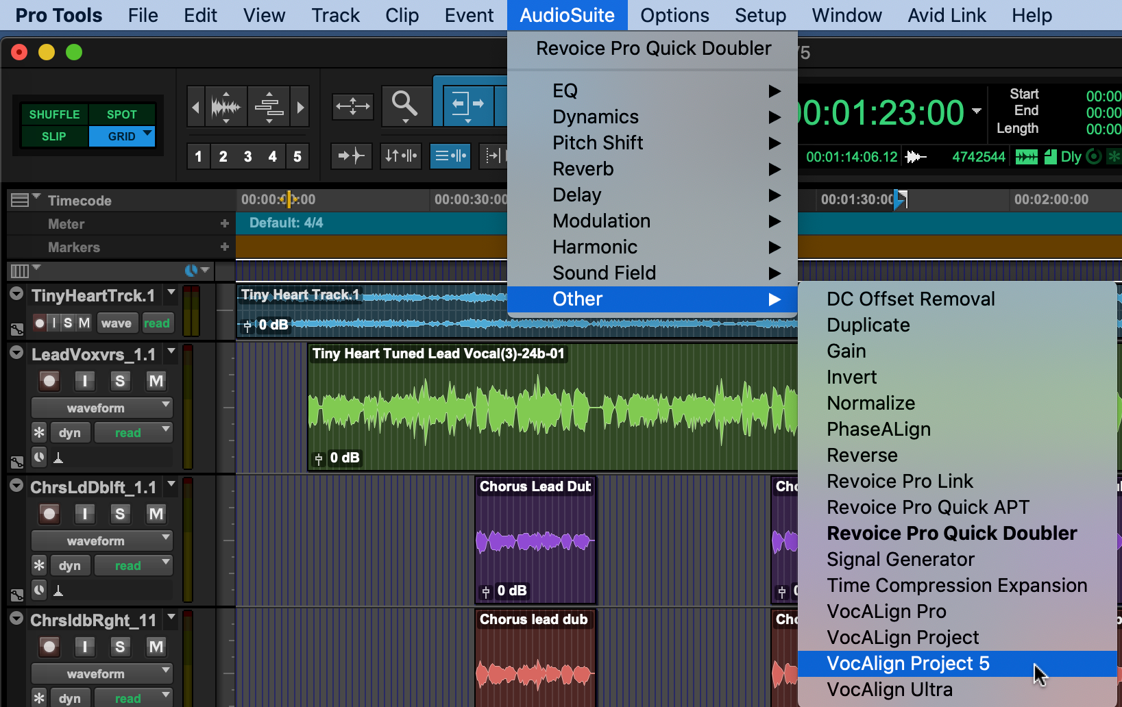 NOTE: If you have both VocAlign Project 3 and VocAlign Project 5 installed, you’ll see both of them listed in the AudioSuite menu, as VocAlign Project and VocAlign Project 5, respectively.