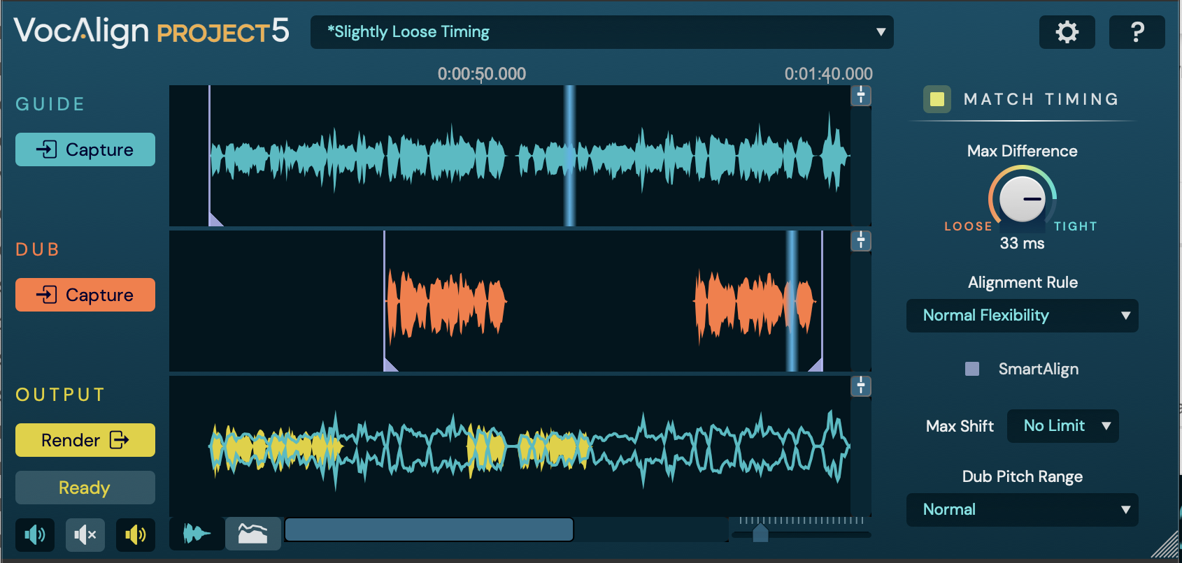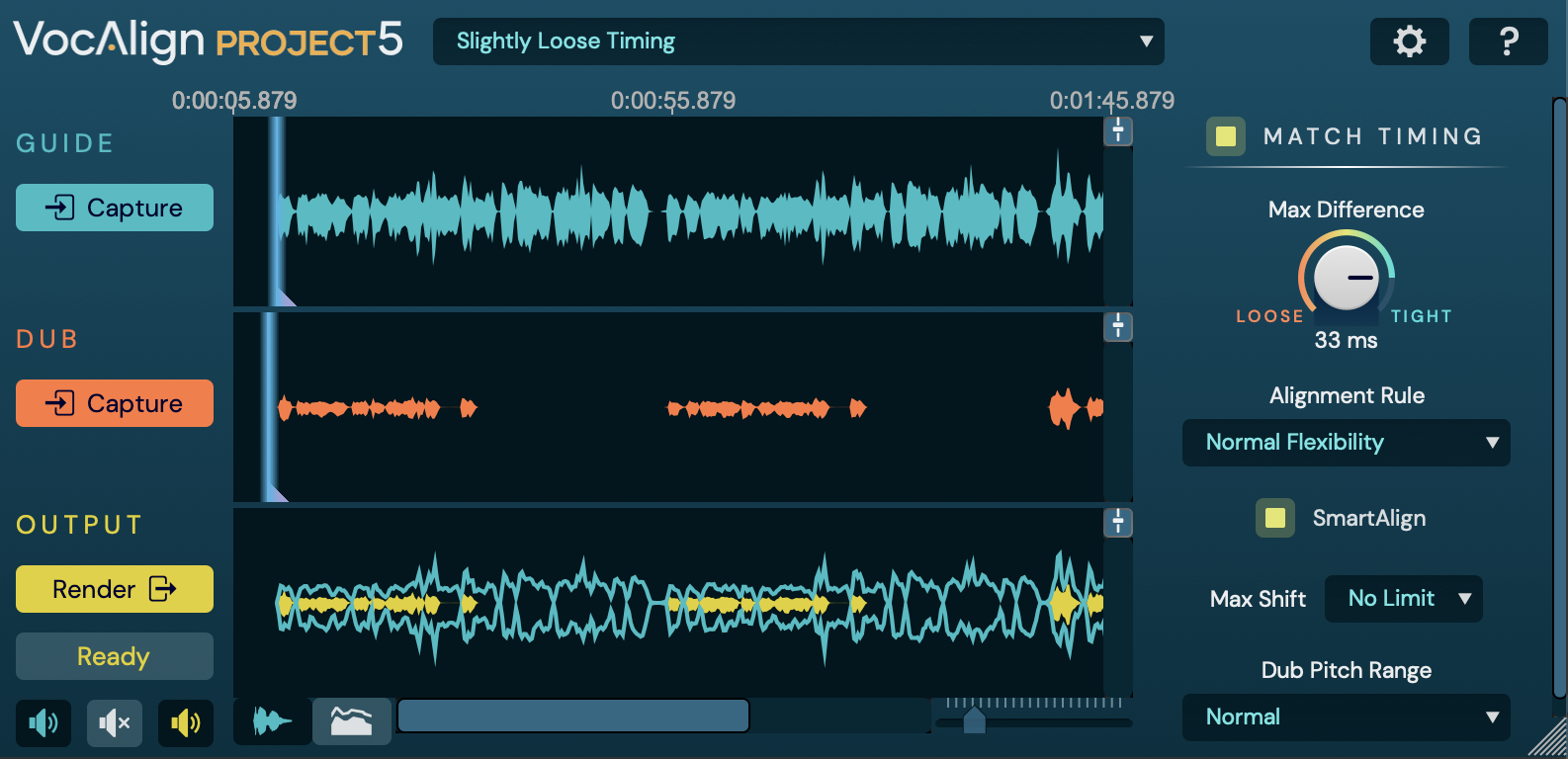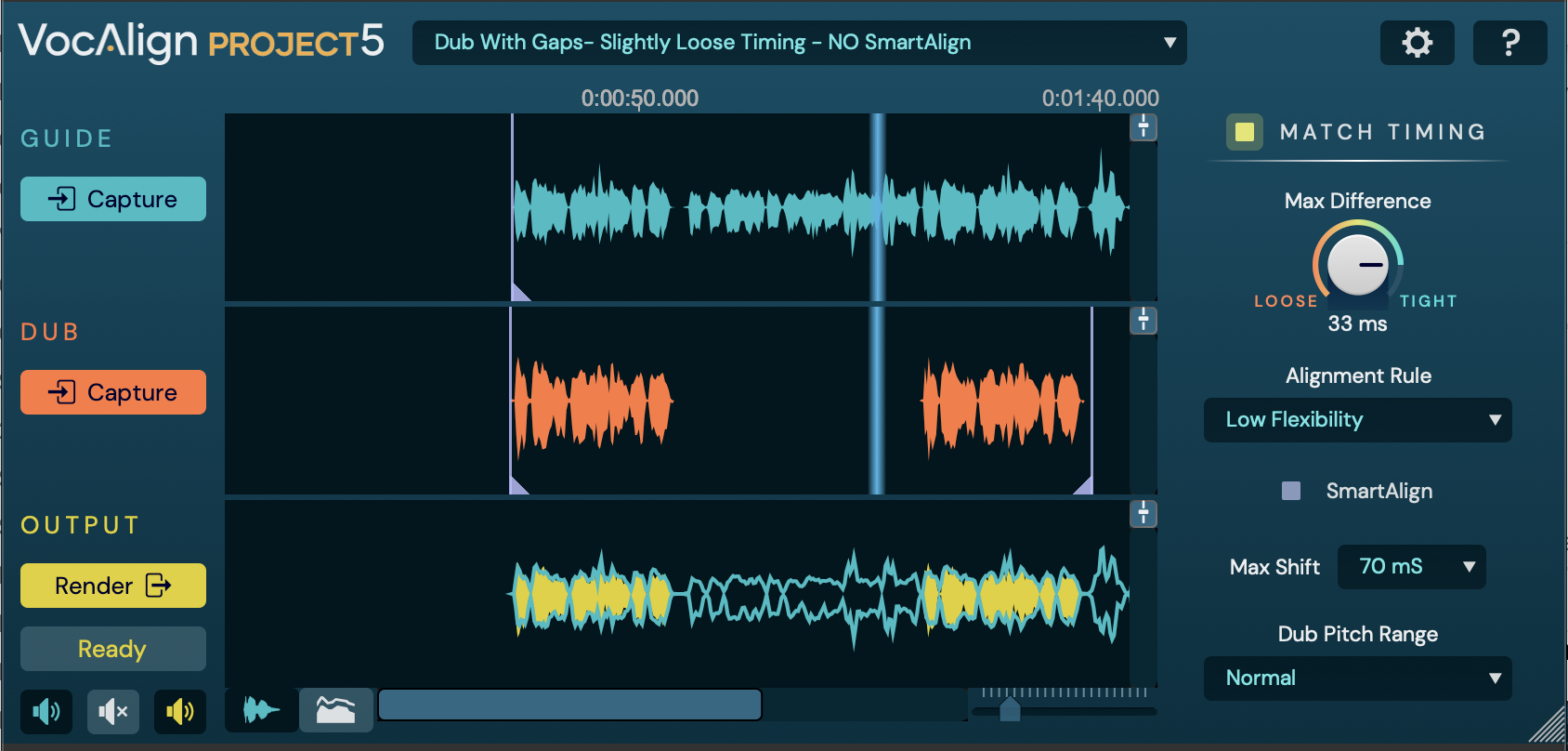 - In VocAlign Project 5, click the Dub Capture button to load the selected signal into the Dub section and automatically process the Dub based on the control settings established by the Preset. Given that the audio selections are over 2.5 minutes long, it will take a little while to analyse the signals for the first time.
