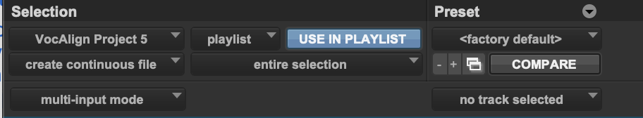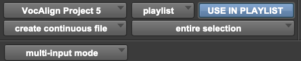 - In the AudioSuite menu at the top of the plugin, make sure USE IN PLAYLIST is activated (in blue), as shown below. If it is not activated, the Rendered audio returned from VocAlign Project 5 will not appear in the Pro Tools tracks (Playlist).