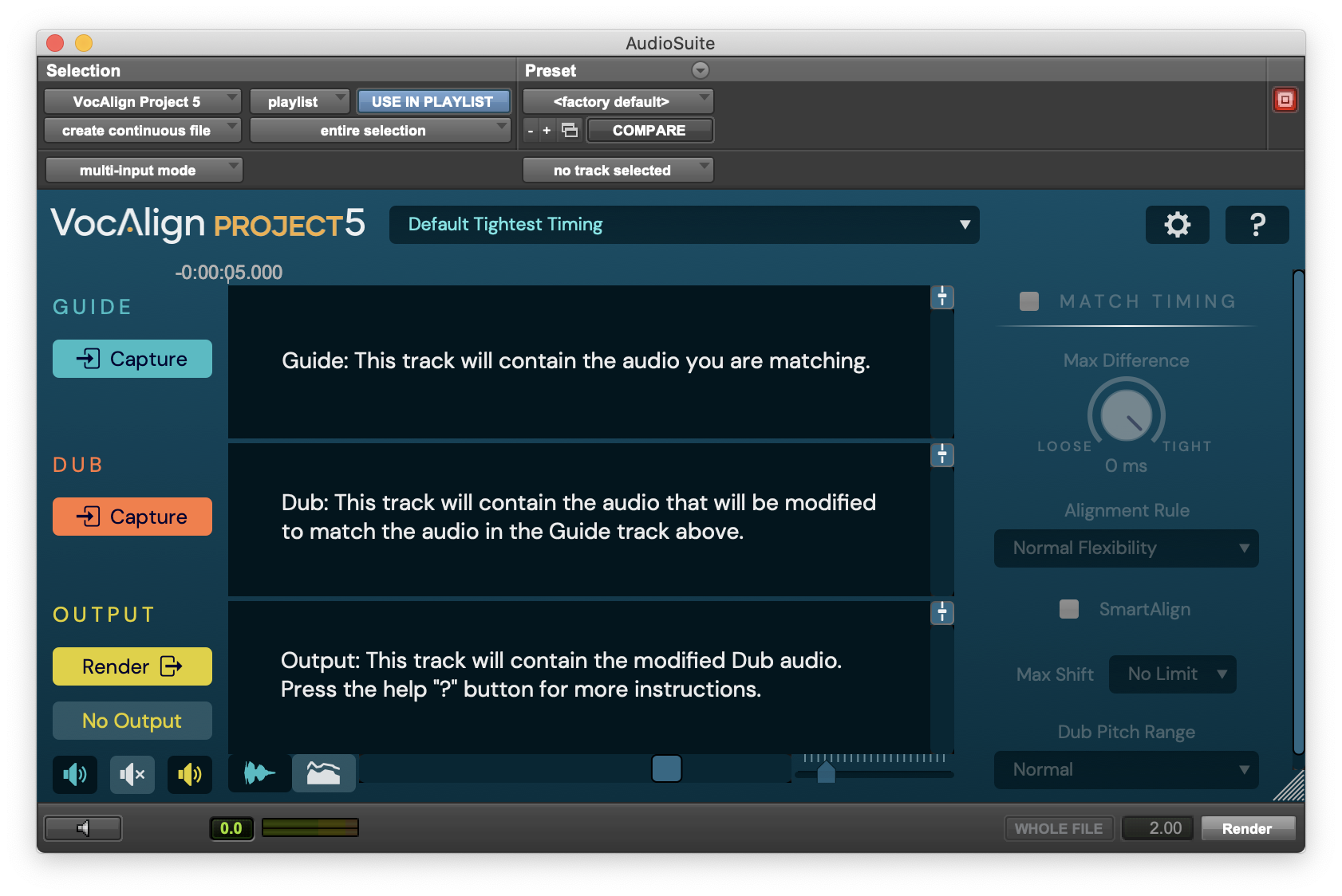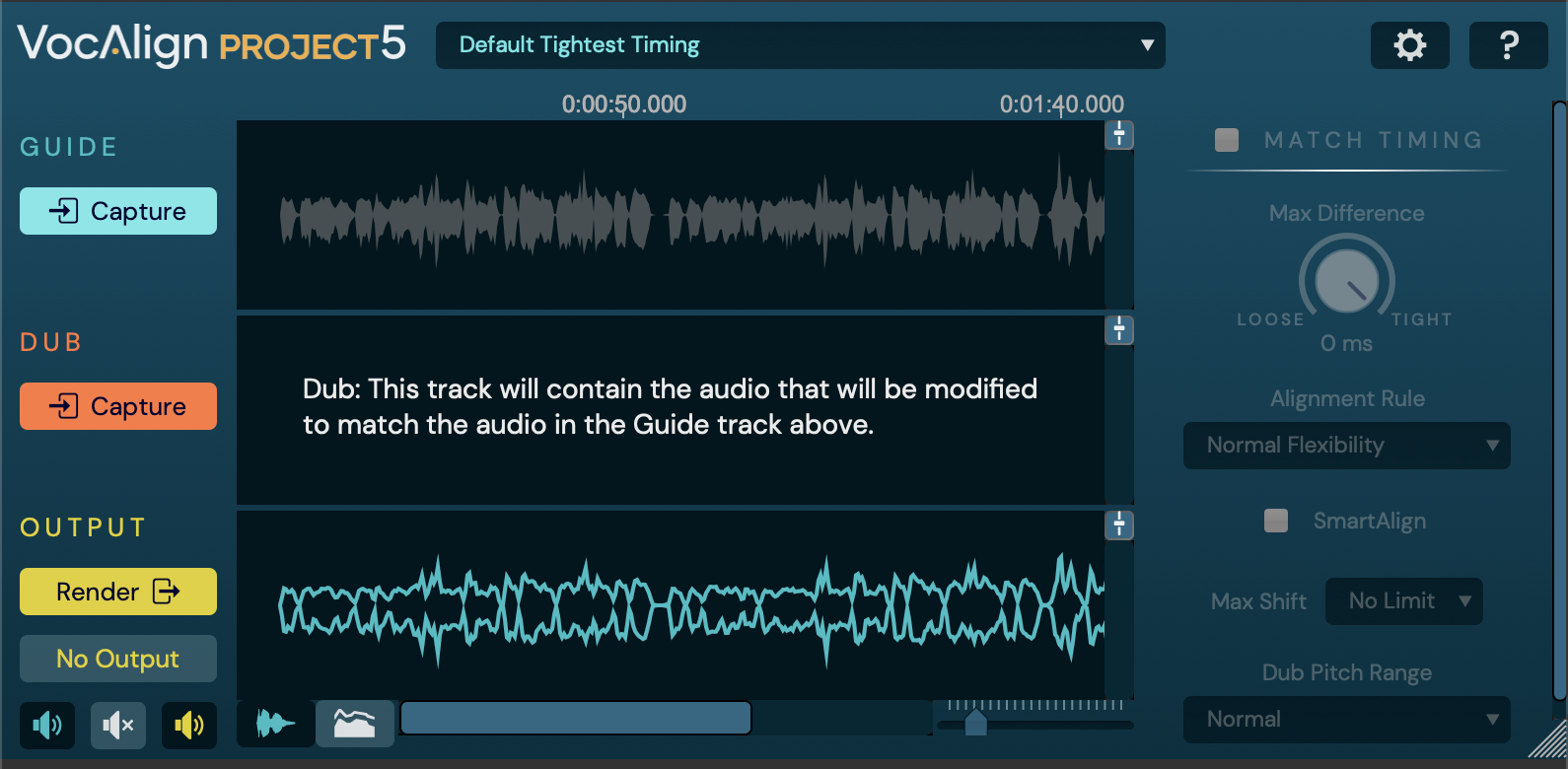 The one control that will always make a difference is the Match Timing switch at the top of the control section. If you turn it OFF, no processing will be applied; i.e. the Output audio will be the same as the Dub input. You can use this for A/B comparisons, but if you can't use the AudioSuite Preview buttons (as described above), you must Render each output to Pro Tools to audition it.