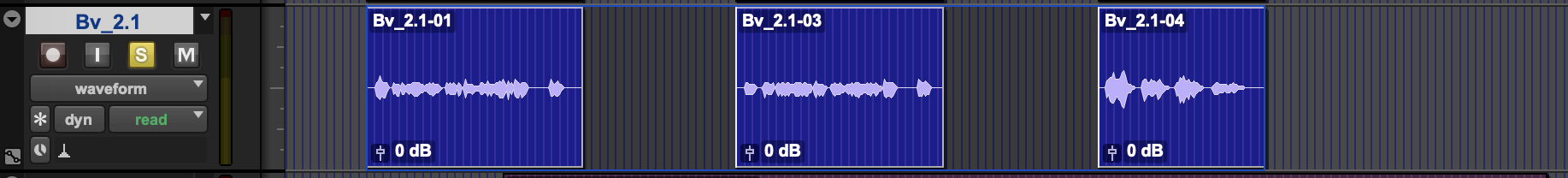 - In Pro Tools, select the three sections in track BV_2.1 (5 tracks below the Guide) as shown in picture below. This will be the Dub audio. We are choosing this track because you easily can hear the timing is off and it changes from a double to a harmony part. Plus there are large gaps between the 3 sections.