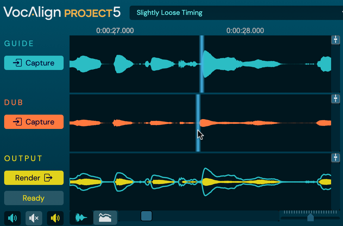 The light blue lines follow the mouse pointer along the Guide and Dub waveforms to show the calculated offset between matching features of the Guide and Dub that the settings are aligning. In the picture above, the Dub at its blue line starts ahead of the Guide at its blue line, but the output Dub (in Yellow) is shown aligned.
