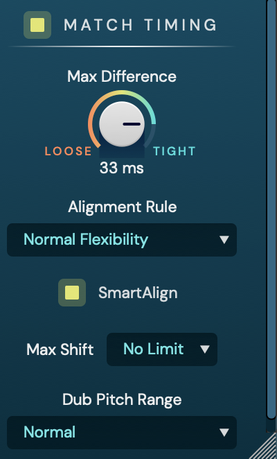 Once you have auditioned the Dub, you might decide you would like it to have tighter or looser alignment, or perhaps less time compression and expansion that make the output sound aligned but slightly unnatural. There are a few controls that you can use to try and create a different result, but the alignment algorithm sometimes won't change as much as you might expect and you have to experiment a bit.