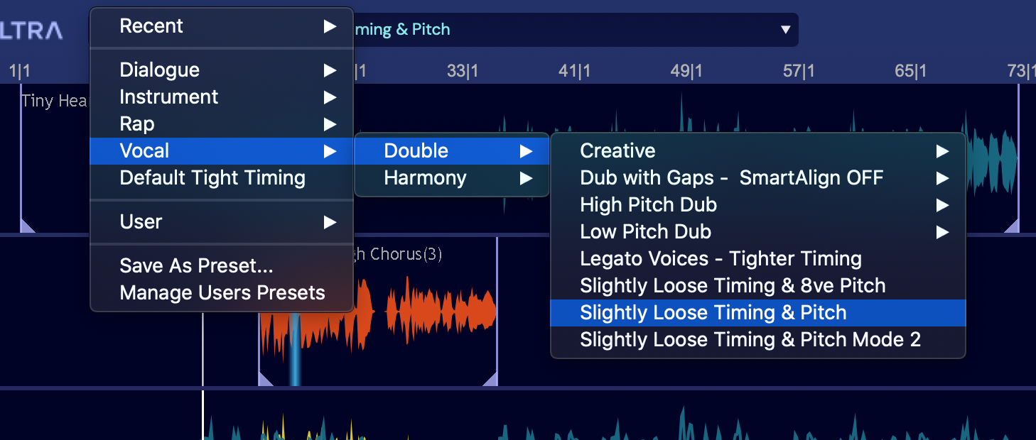 A VocAlign Ultra preset is really just one particular configuration of all its parameters, made to help you complete a specific music or post-production task. The factory presets should be useful as starting points for most cases.