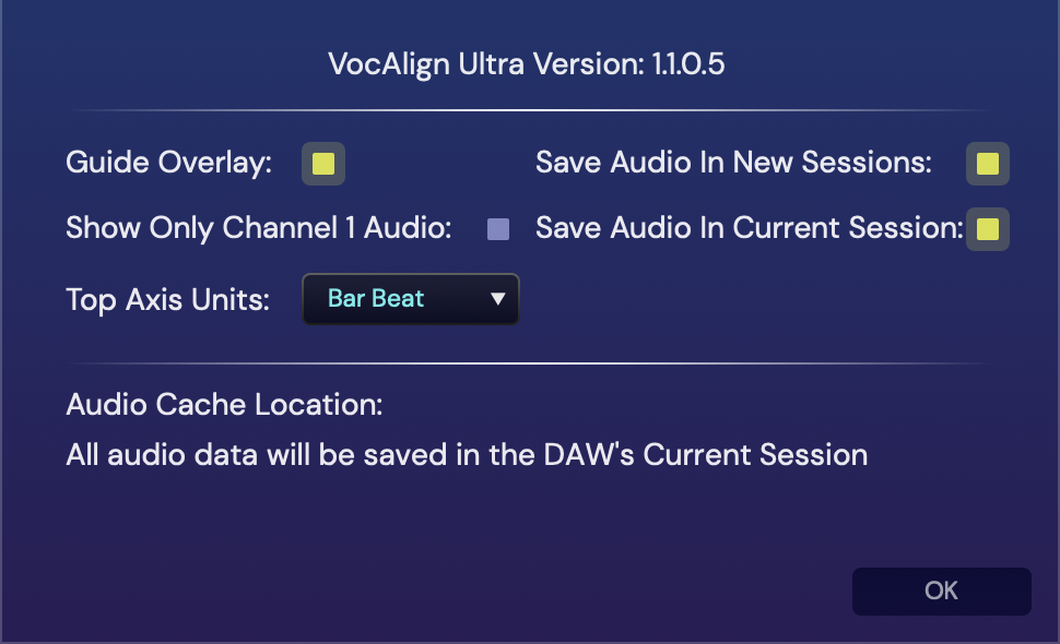 Another clue is in VocAlign Ultra’s “Settings” dialogue box (shown below in Fig.4) which displays the Audio Cache Location path for the local directory that the plug-in is using to store its audio for the current session. This may also help you determine which subdirectories are still in use.