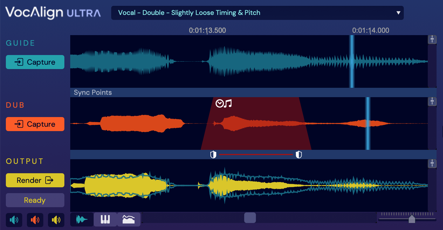 In VocAlign Ultra, click the Dub Capture button to load the selected signal into the Dub section and automatically process the Dub based on the control settings established by the Preset.