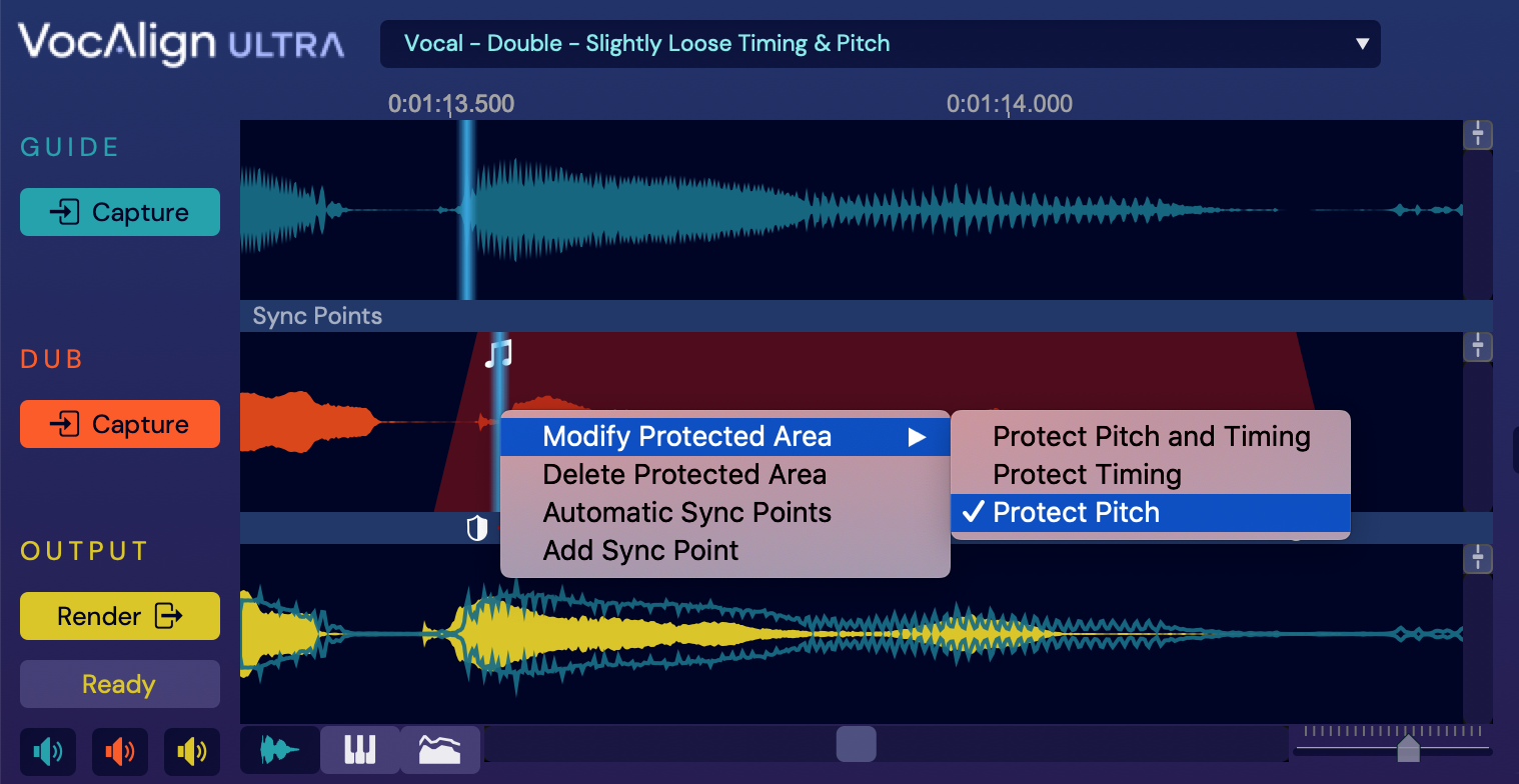 1. Drag the ‘shield’ handle at the right hand end of the Protected Area to encompass the last ‘piece’ of the Dub waveform, then right-click in the Protected Area and select Modify Protected Area > Protect Pitch – now the timing will be aligned but the pitch won’t.
