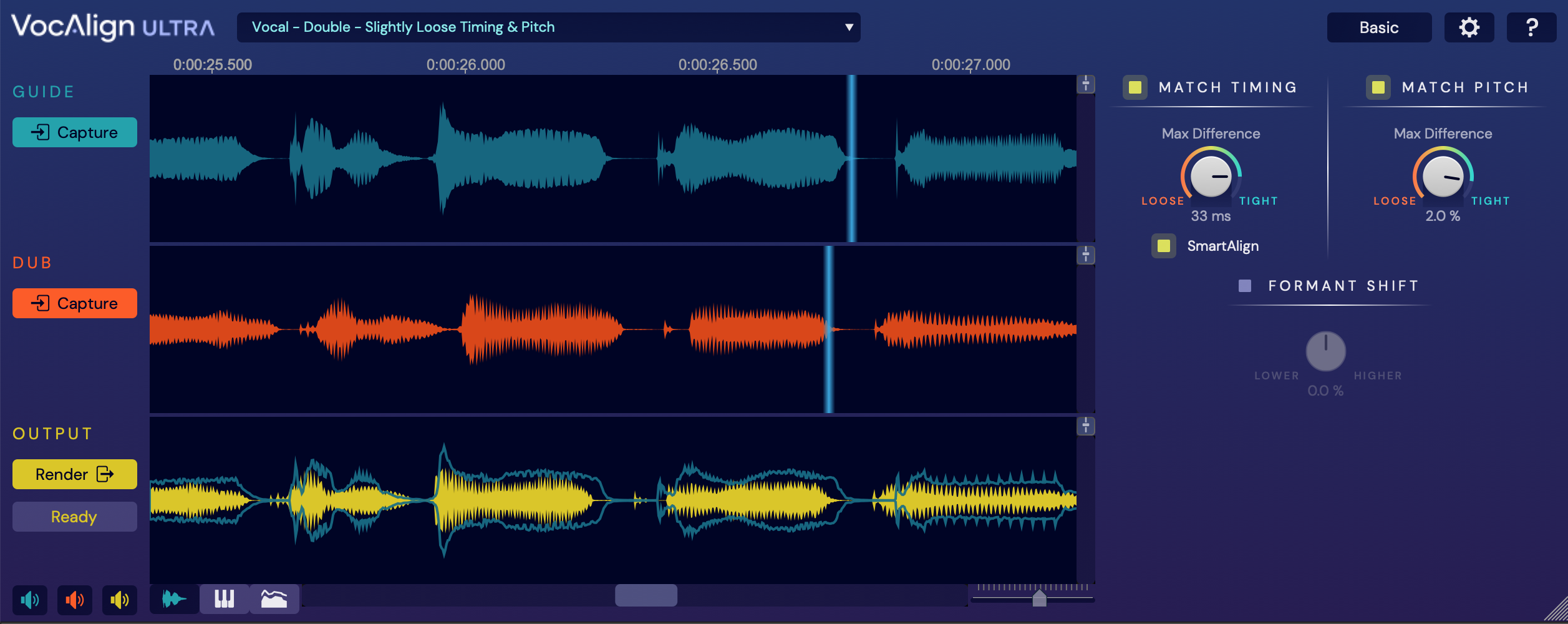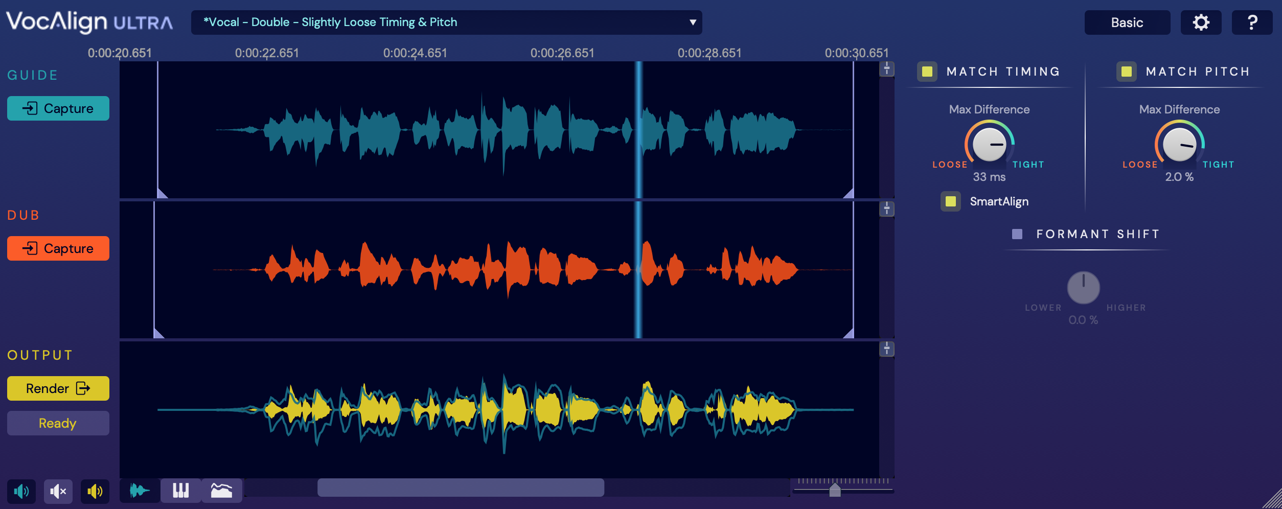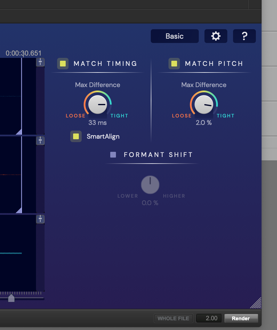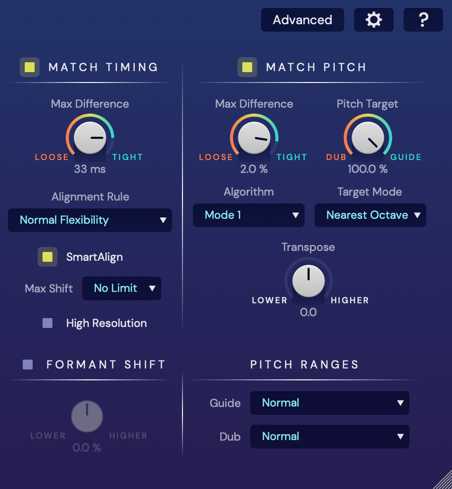 Let's make sure you see all the controls this time. Press the Basic button to switch to show the full Advanced controls. These are explained in detail in the Using VocAlign Ultra section of this VocAlign Ultra User Guide.