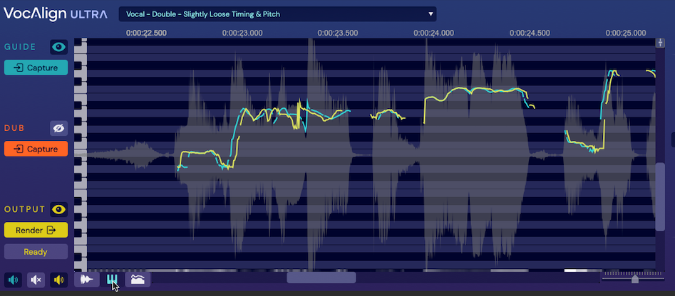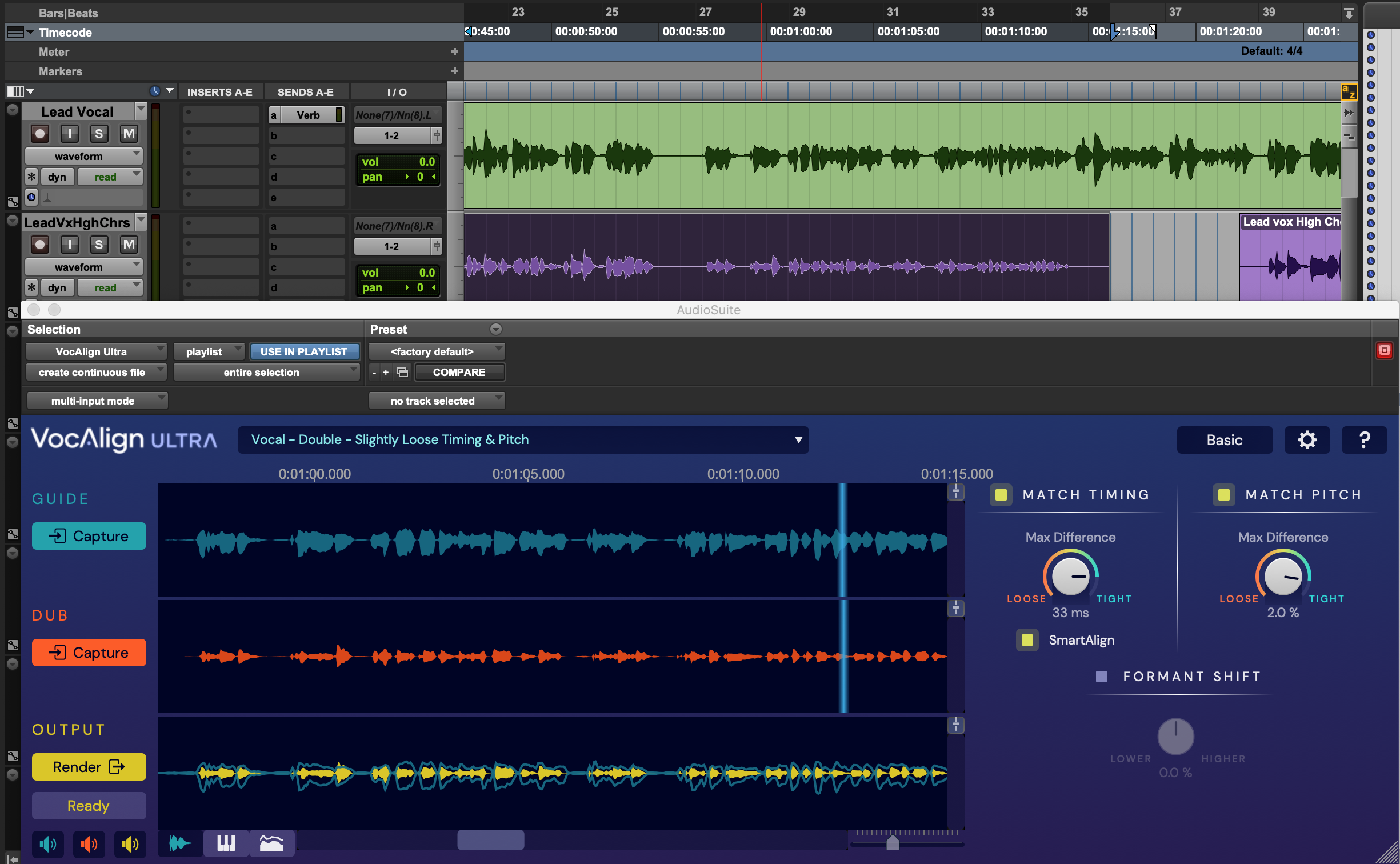 1. The second track is a double of the first (even though they're an octave apart), so in VocAlign Ultra, select the Vocal – Double – Slightly Loose Timing & Pitch preset before Capturing the Dub. This ensures that the Dub will be processed with this setting as soon as it is Captured.