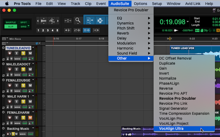 2. Load the VocAlign Ultra plugin by opening Pro Tools’ AudioSuite menu, selecting the Other submenu, then selecting VocAlign Ultra as shown below.