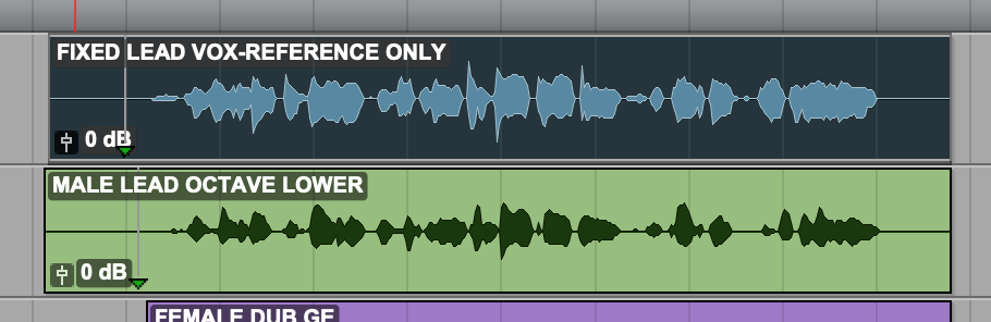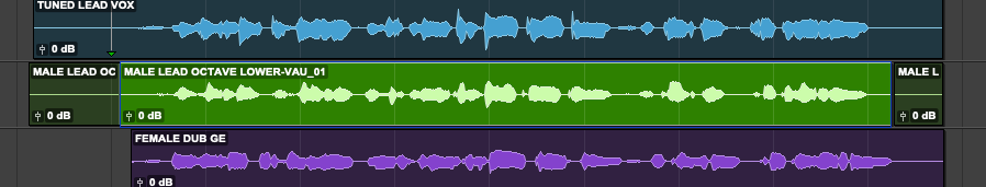 1. In Pro Tools, select the clip ‘MALE LEAD OCTAVE LOWER’ as shown in picture below. This will be the Dub audio. When working with SmartAlign, the start times of the Guide and Dub clips do not need to be the same.