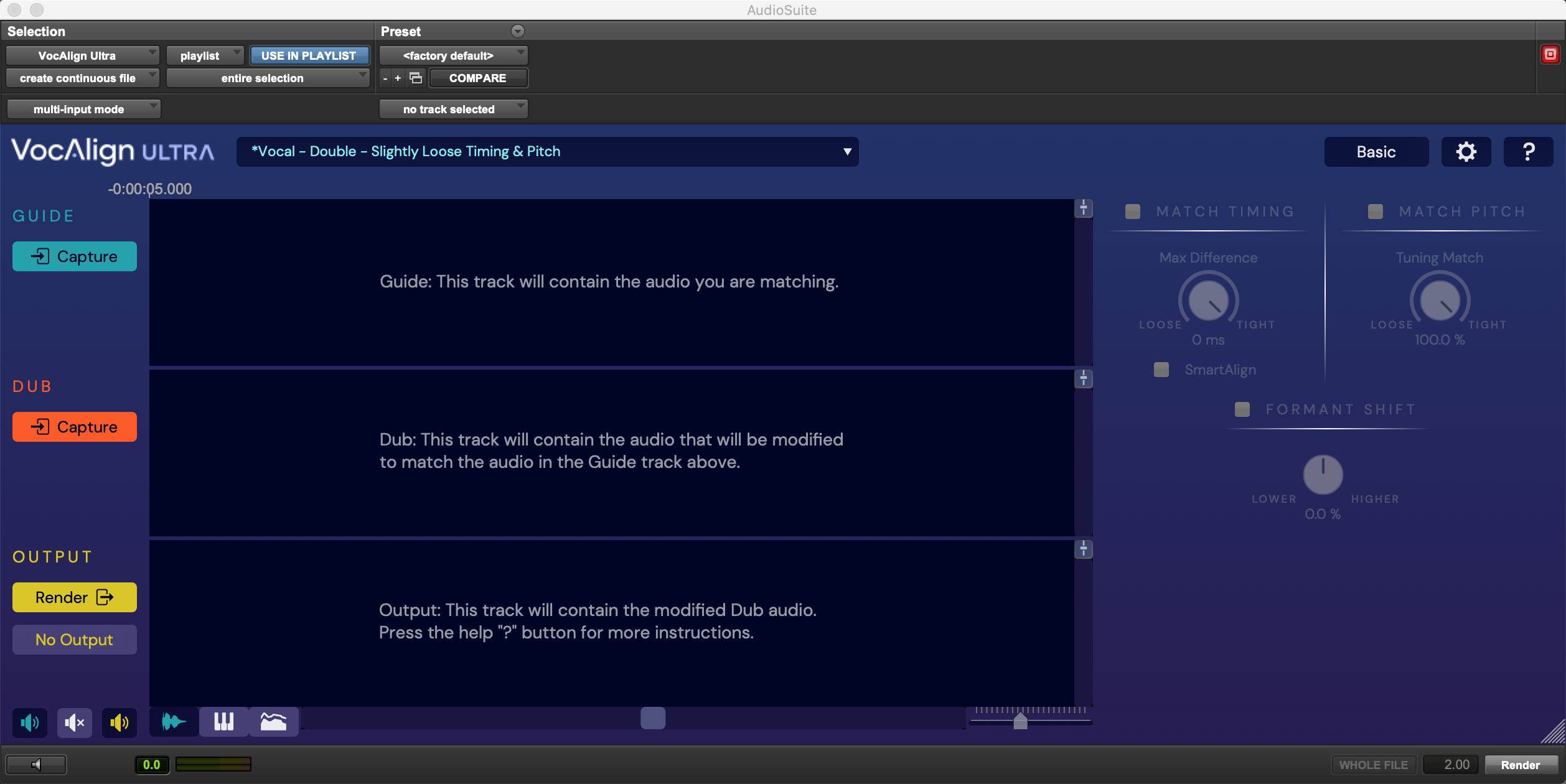 NOTE:  You can transfer the Output from VocAlign Ultra to replace the original Dub (as we did above) or transfer it onto any other track in Pro Tools by selecting a time range larger than a single sample anywhere on the target track and clicking the Render button. Or you can change the Audio Suite Track selection button (bottom right of picture "no track selected") to chose a Target track to render to.
