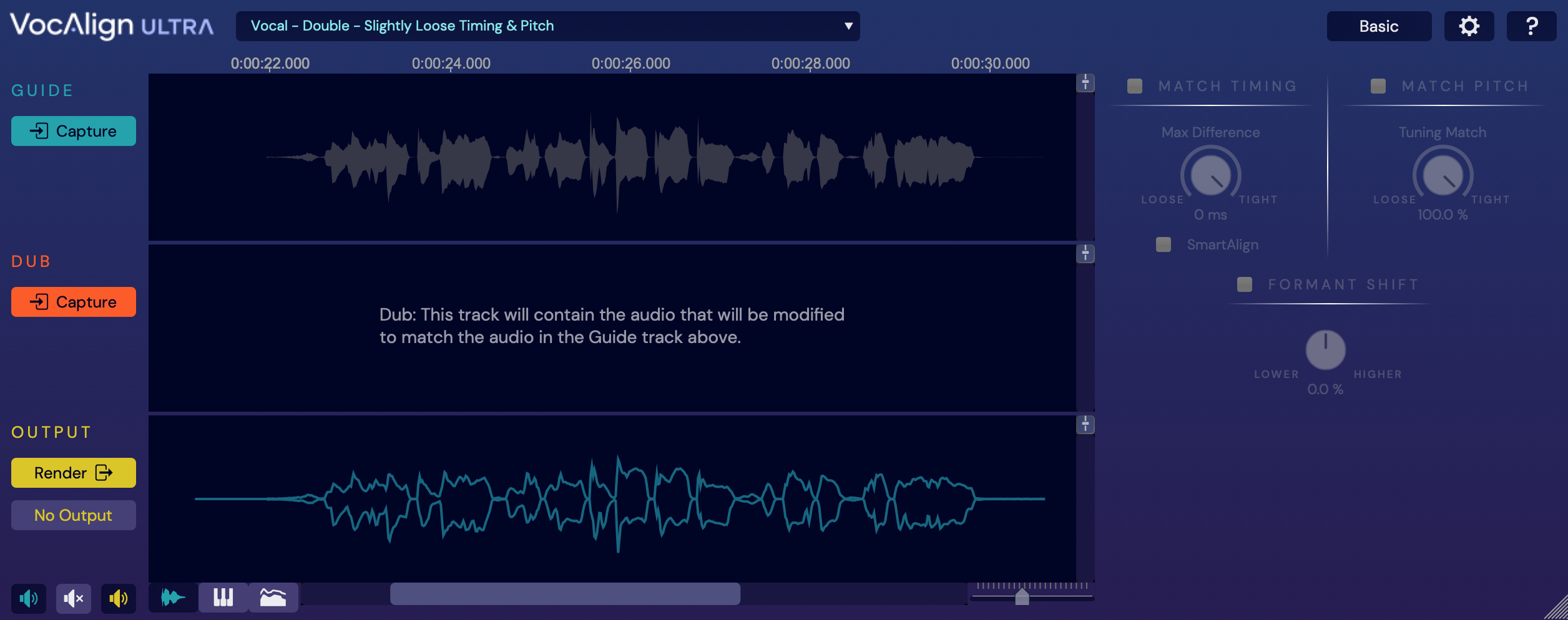 Then, activate and deactivate the 'eye' buttons to see the Guide and Dub Pitch traces, then the Guide and Output Pitch. Turn the Match Timing and Match Pitch Max Difference controls and observe the effects of tighter and looser settings on the traces.