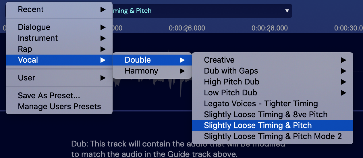 Now we will process the Female Dub. This is the same pitch as the Guide, so use the Vocal – Double – Slightly Loose Timing & Pitch setting again, or try any others in the Vocal preset group.