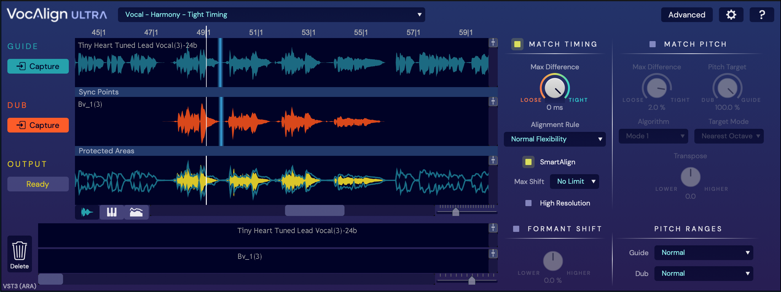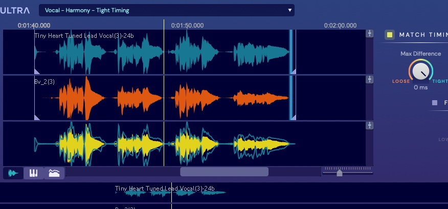 Then select the Vocal > Harmony > Tight Timing preset to perfectly lock BV2’s timing from bars 47-56, but not pitch,  to that of the Lead Vocal region.