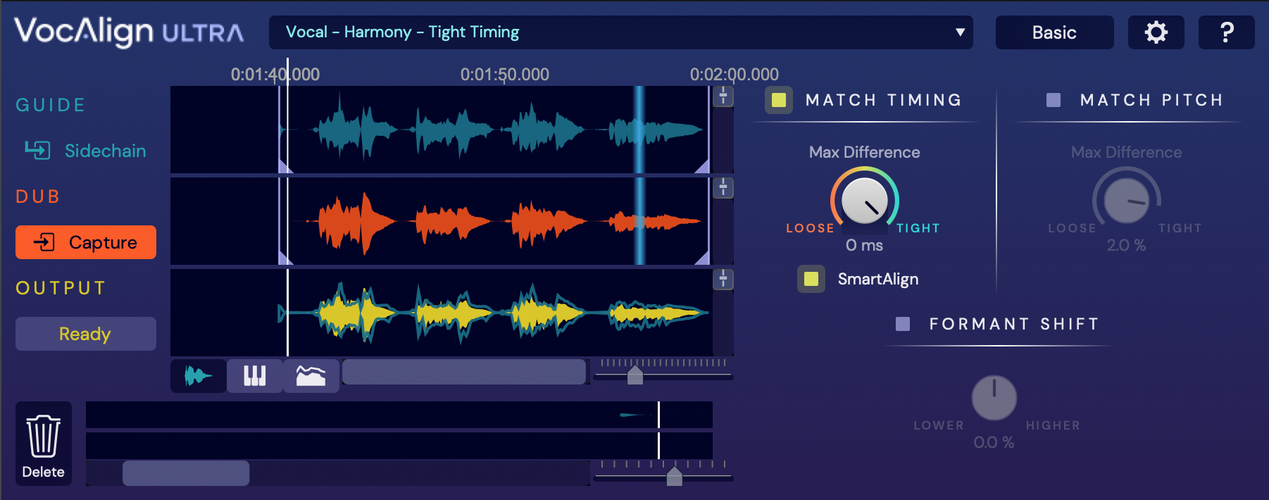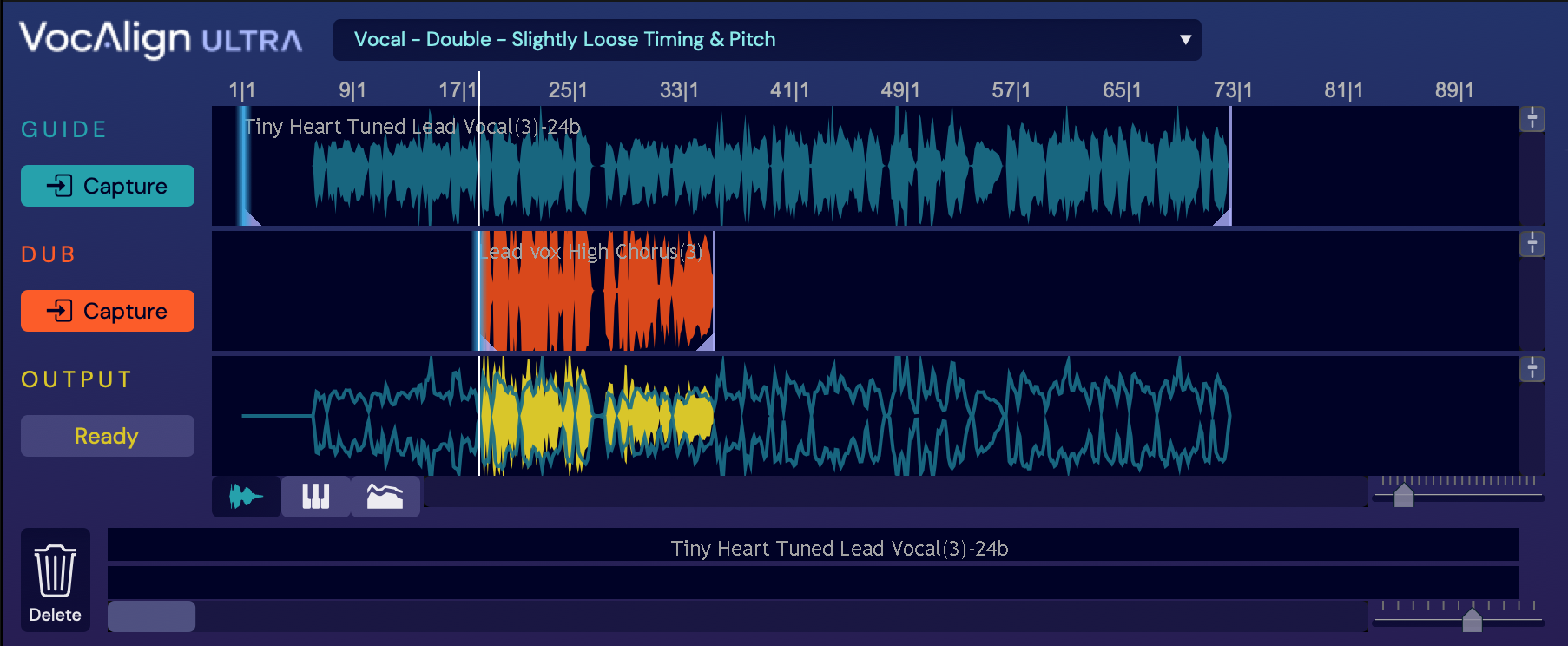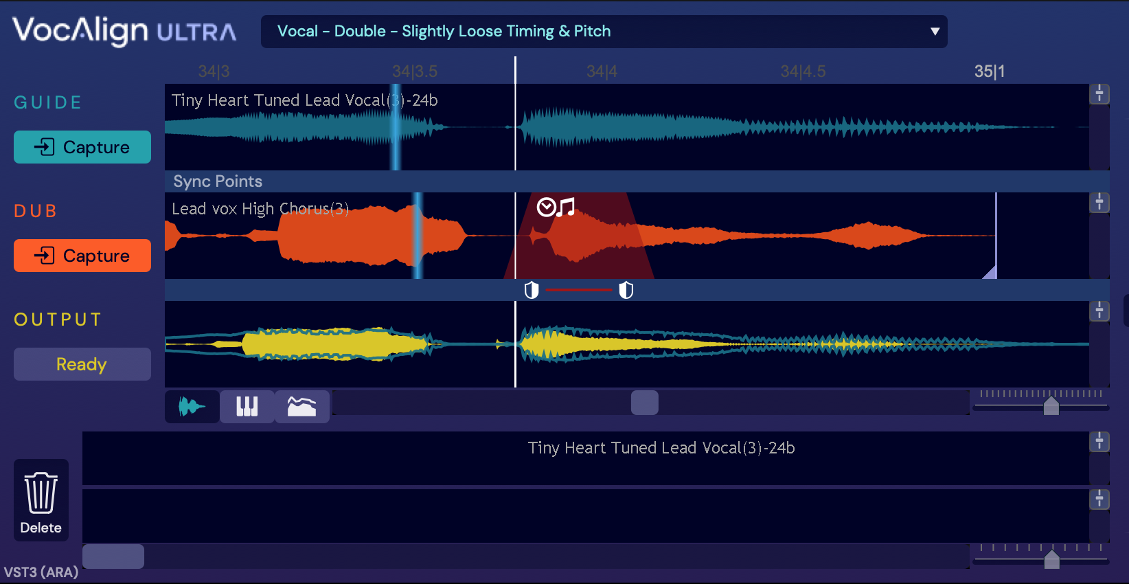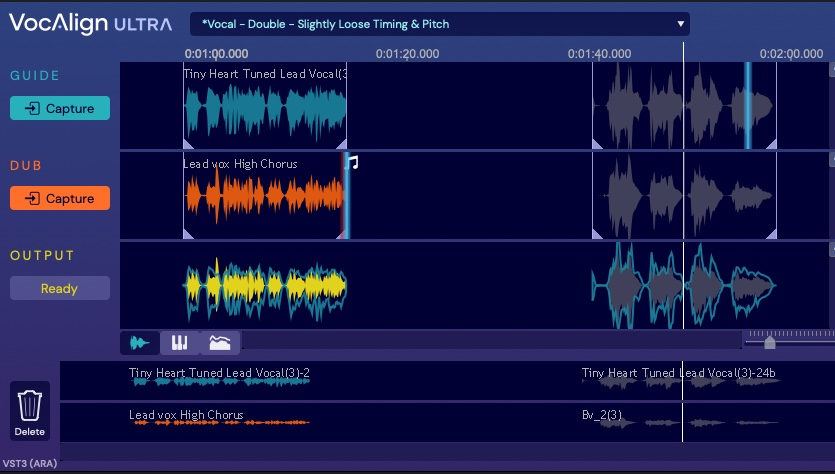 Now select the BV2 audio event and press the Dub Capture button. The Dub will be captured and VocAlign will create the aligned Output, represented by the yellow waveform in the Output section.