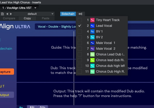 2. At the top of the VocAlign Ultra window set the Sidechain input to the Lead Vocal track. This will be our Guide.