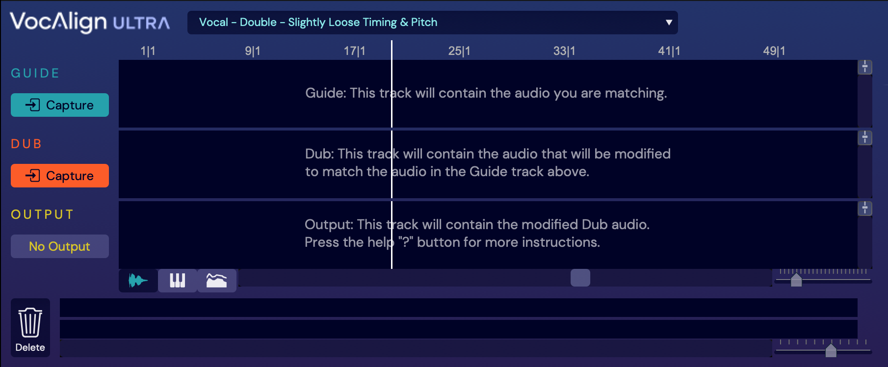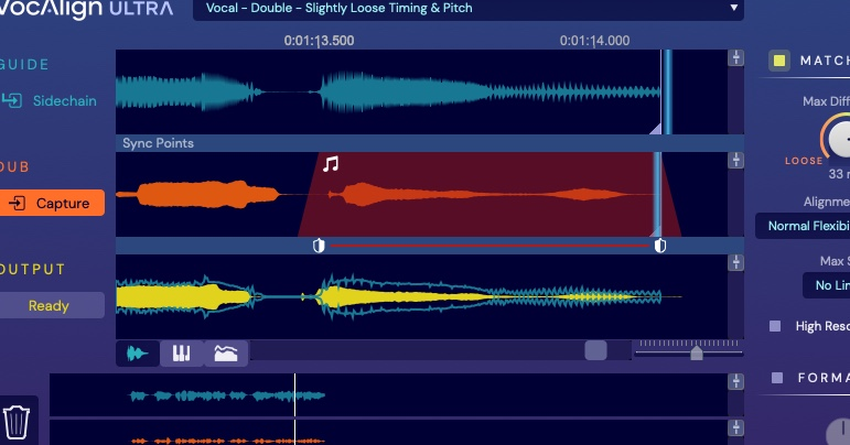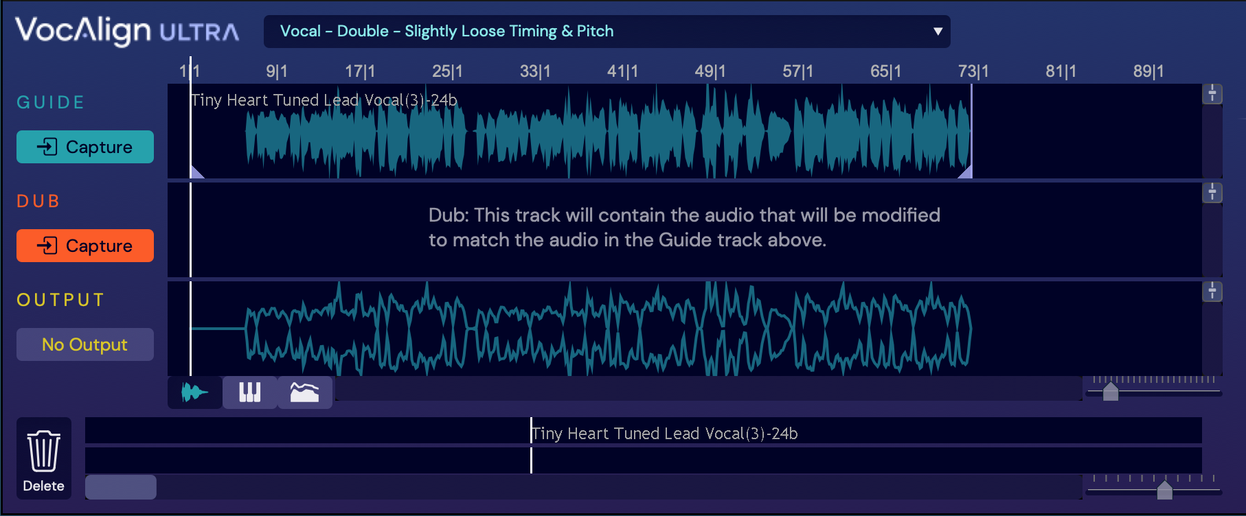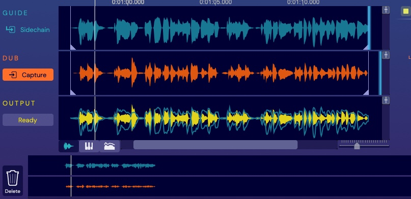 The captured audio waveforms should appear in the Guide and Dub sections of the display, and the aligned Dub will appear in the Output section.