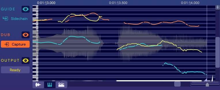 For a visualisation of the signals' pitches, switch to the Pitch Profile View by clicking the keyboard button below the main display, and zoom in on the very end of the Dub. Use the vertical slider at the right of the display and the Scale control above it. You’ll see the Guide (blue) pitch shows an octave drop when it gets ‘creaky’, which affects the pitch quality in the Output signal (the yellow trace).