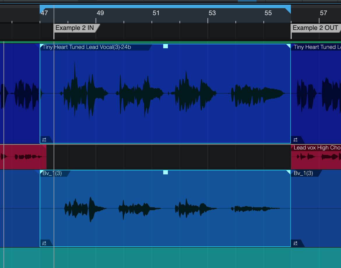 First, split the Lead Vocal and BV2 tracks at bars 47 and 56, and set your DAW’s Cycle markers to cover the resulting range.