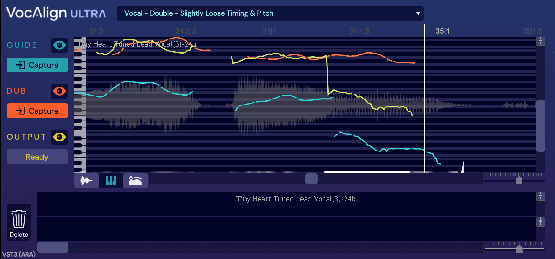• The VST3 (ARA) plug-in is applied in most VST3 DAWs to "events"/"Clips"/"Segments" etc. that you want to process in both Guide and Dub tracks, and the user “Captures” the digital audio directly as the designated Guide or Dub in an "instant transfer” process.  However, in other DAWs, you will apply it in a track.