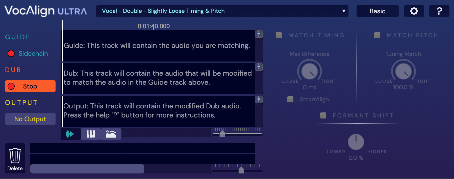 Alternatively, you can use the Delete command to remove the Dubs and their Guide from VocAlign Ultra and then recapture them with a different setting, which the Dubs will all received at the same time and create new Outputs with the new setting.
