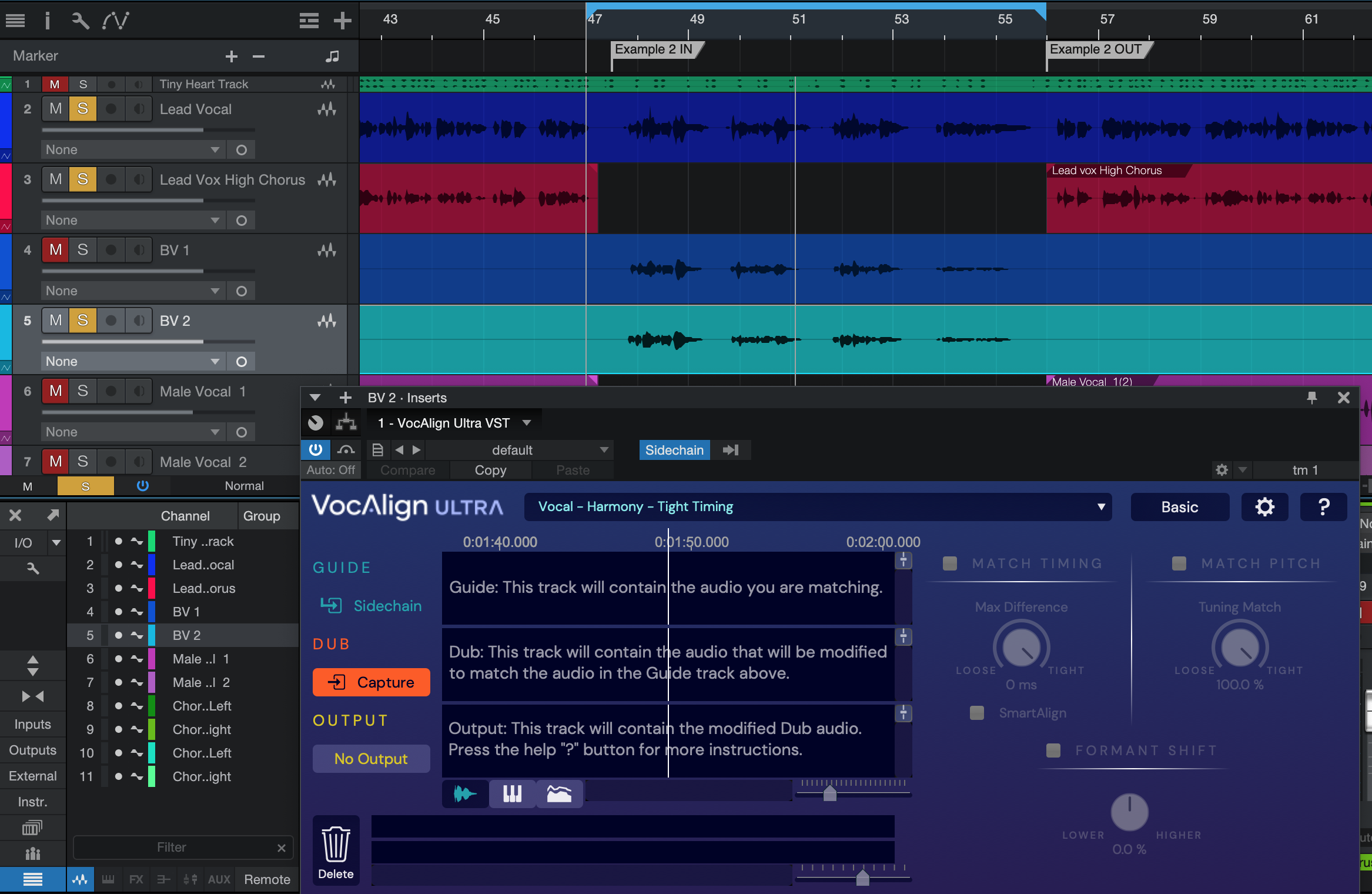 9. Now let’s align a harmony vocal. First, load VocAlign Ultra as an insert effects onto the BV 2 track and select the Lead Vocal track as the Sidechain input, as described in Step 2 above. Set your DAW’s Cycle range to cover bars 47-56.